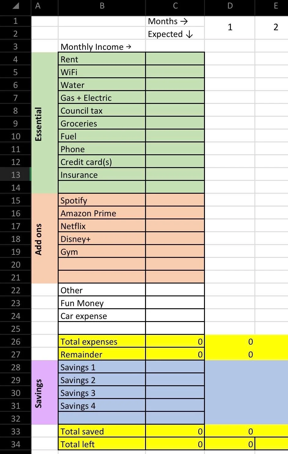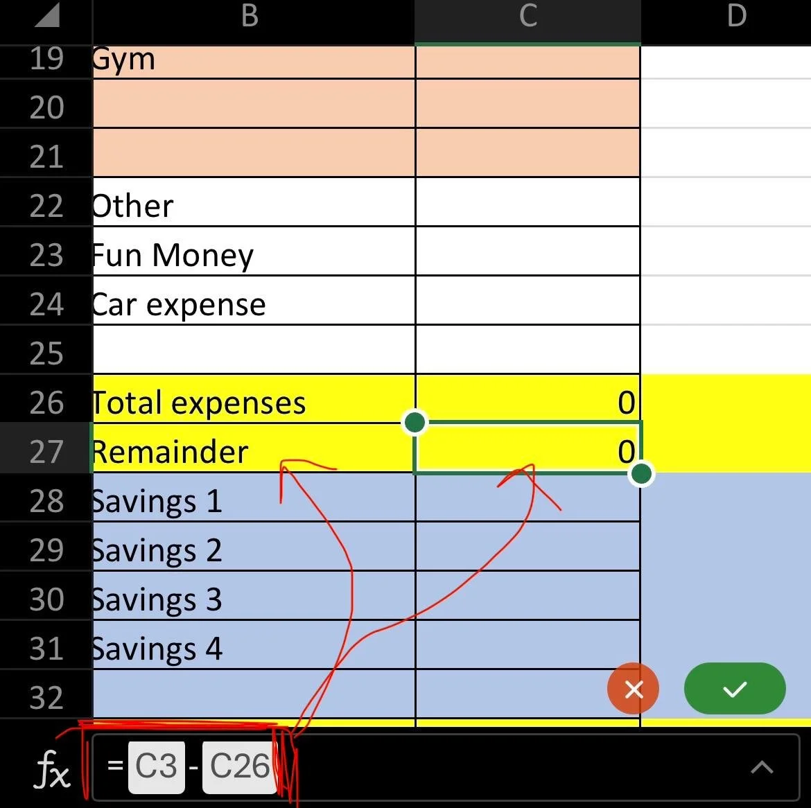 Click enter, and it should give you a negative number. The aim is that in row 1 of each column, you put the total income you get that month. So, the remainder row (which is above your savings), shows you how much money after your expenses you have to put away in savings.