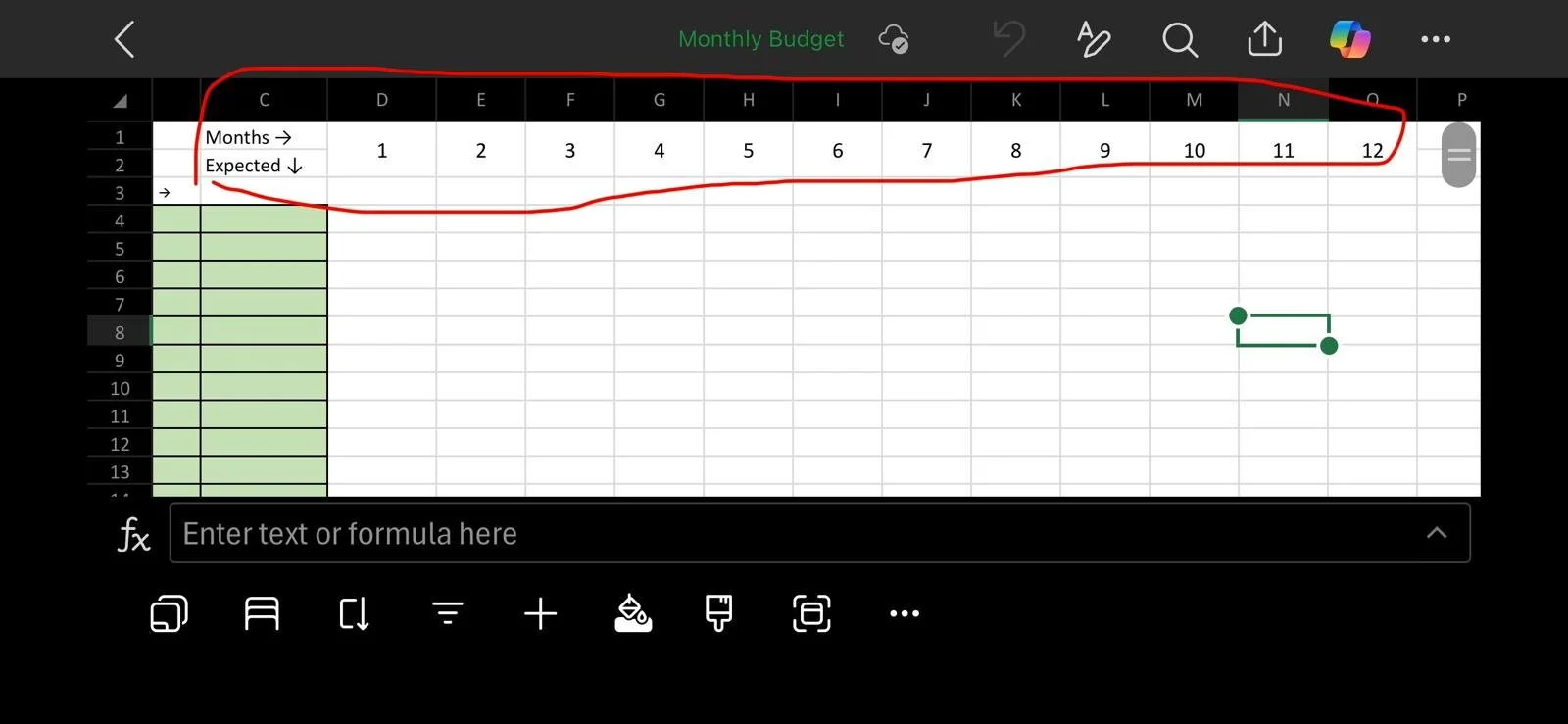Start in row 2* of column C, with the month we are in as of creating this, and thus write each month in a separate column until you have covered 12 months. I left out the A and B columns on purpose, see step 3.