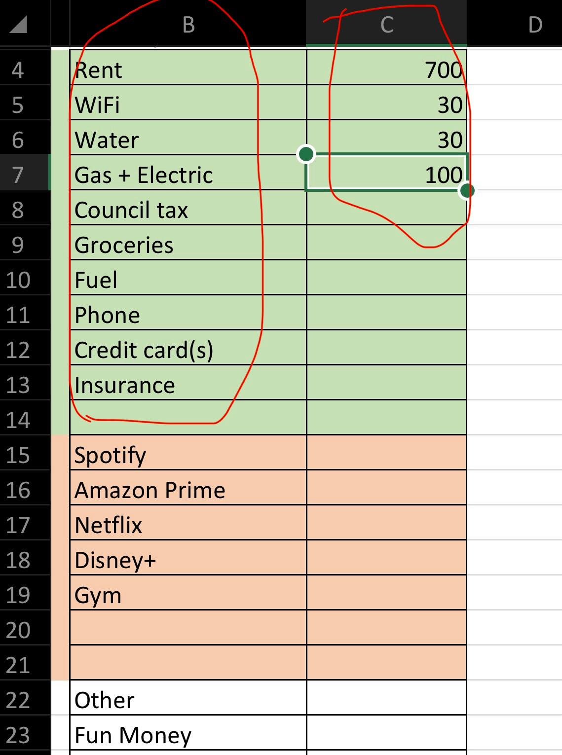 In column A (row 3*), this is where you put the labels of things you spend money on monthly. Such as rent/mortgage, bills, groceries, fuel, debt, savings, streaming services etc. Anything you pay regularly each month.